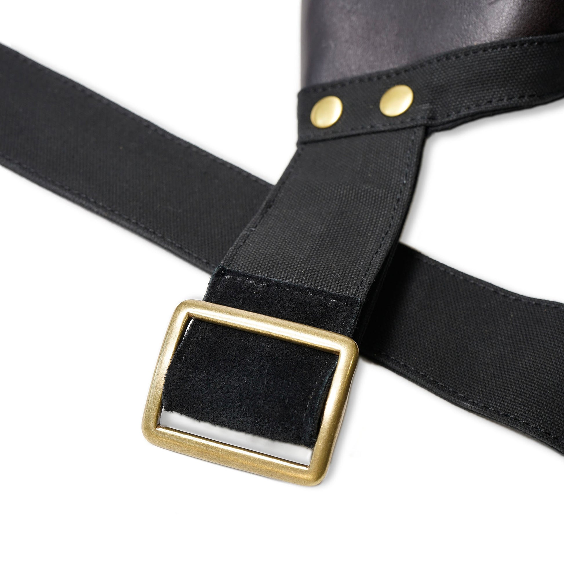 風でのバタつきから内容物を守るため、フラップ部を止めるレザーの調整ベルトを装備。