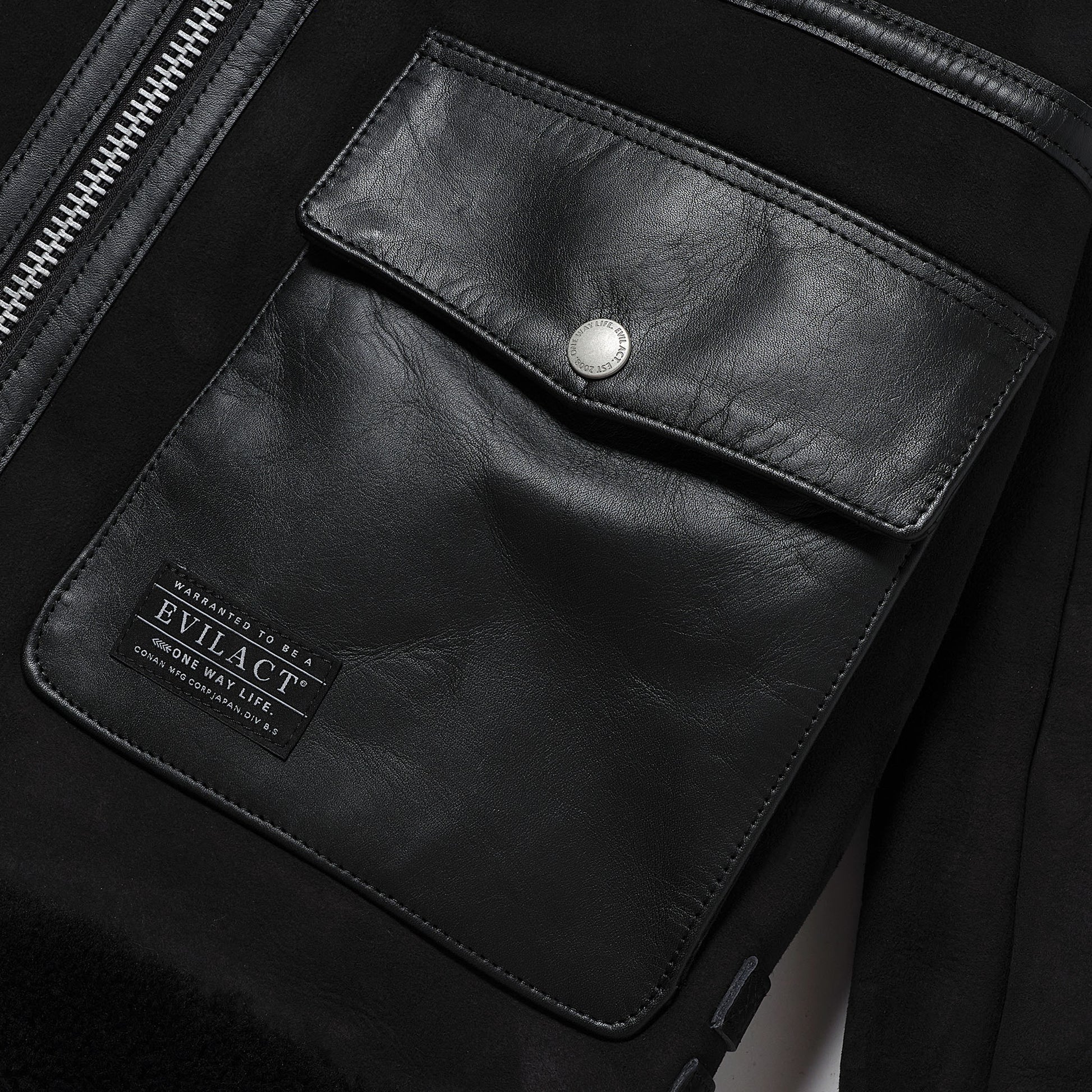 フロントの外付けポケットはサイドポケットにも使用できる、シルエットと機能性に拘ったパターンでデザインしたEVILACT B-3 JKT。