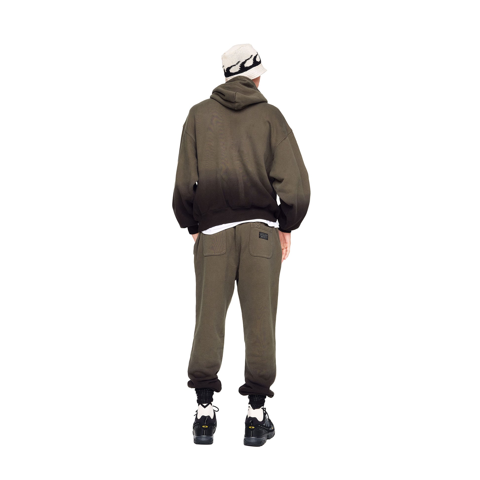 HEAVY OZの裏毛生地を使用し、VINTAGEライクなパターンに再構築。下から段階的に染色加工し、全体的に色味をグラデーションさせることにより、経年変化を演出したプルオーバーフーディ。フロントにEVILACT COLLEGE LOGOが染み込みプリントであしらわれている。