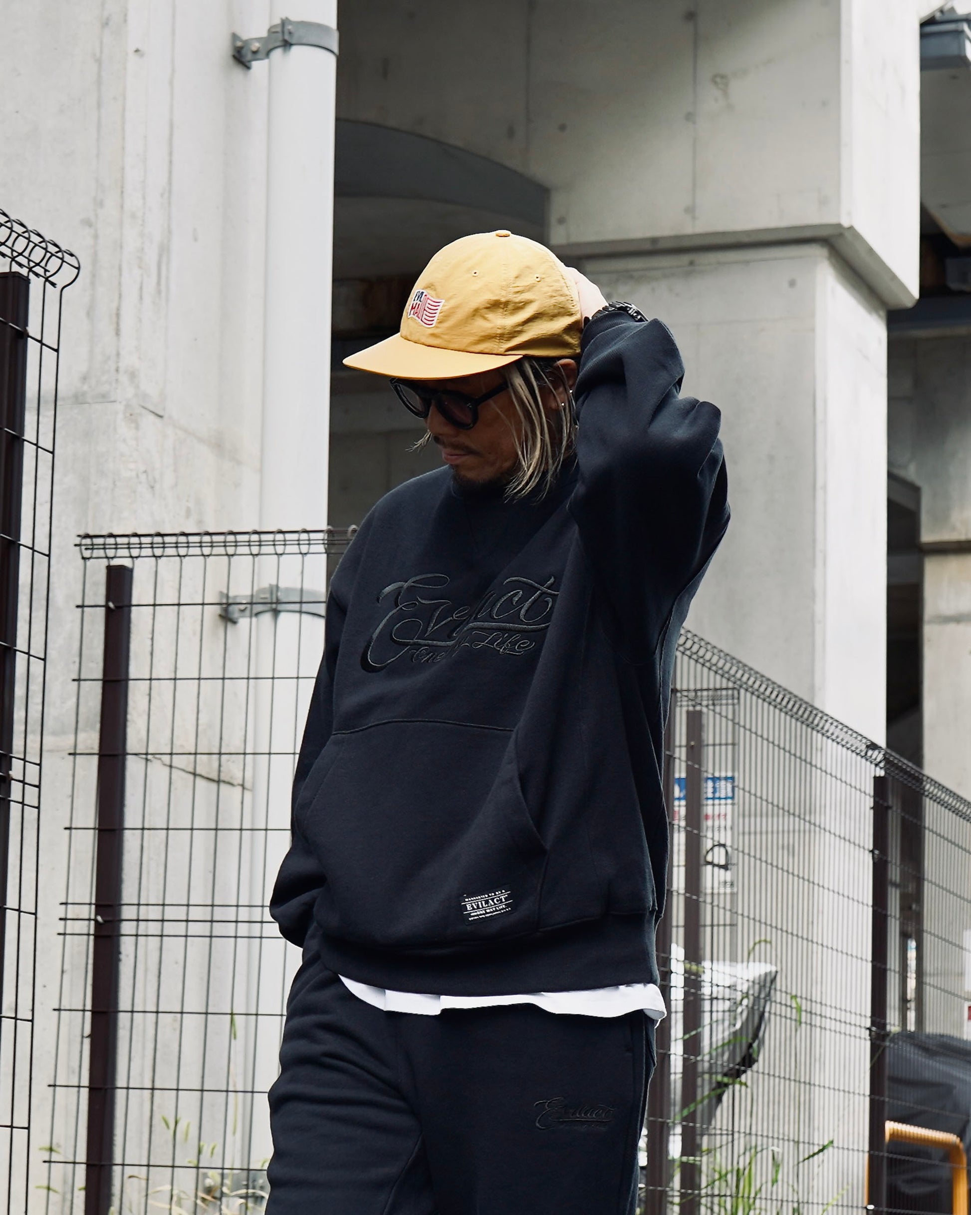 クルーネックには珍しいカンガルーポケットも搭載しフロントにEVILACT LOGOが贅沢に 同色刺繍。