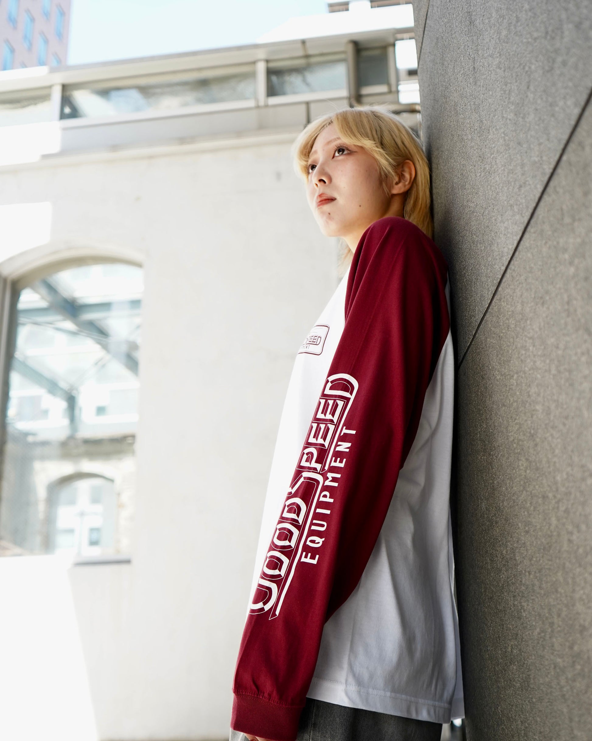 GOODSPEED equipmentオフィシャルロゴデザインのラグランロングスリーブTシャツ。袖口はリブ仕様。5.6ozのライトな着心地。